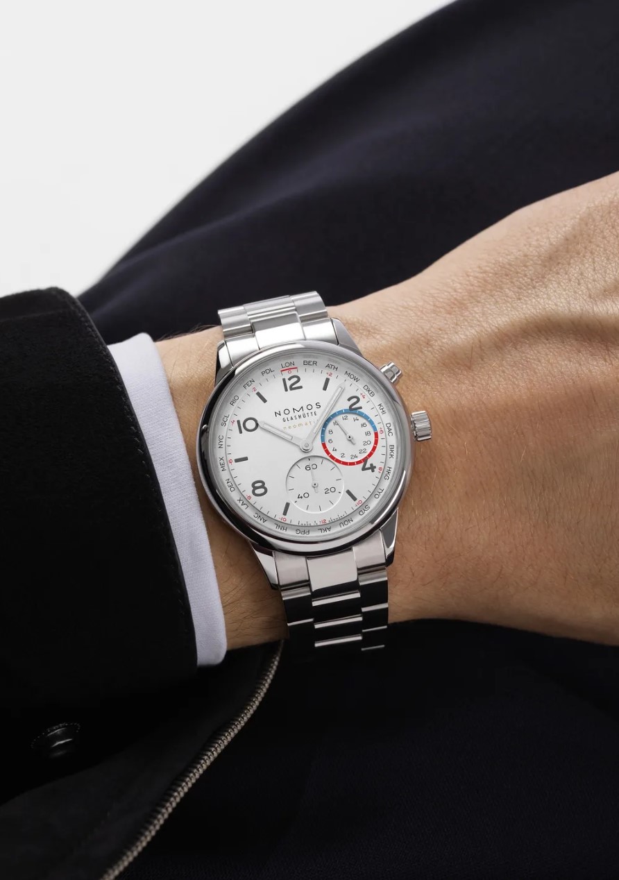 Made for life across time zones: With a white silver-plated dial, the multilayered display of Club Sport neomatik Worldtimer takes on a streamlined appearance. This worldtime watch is versatile and perfect for everyday use, elegantly slim yet full of functional features. Superluminova – white on the hands and gray on the hour indexes – glows blue in low-light conditions. Otherwise, the only touches of color are the small red numerals around the edge of the main dial, the red marker highlighting the local time, and the outer ring of the home time subdial.
