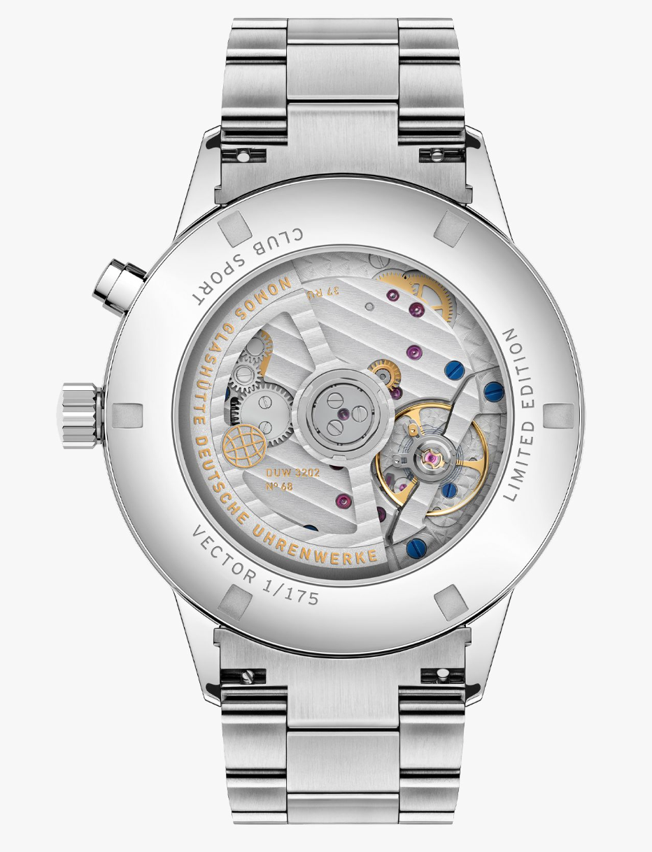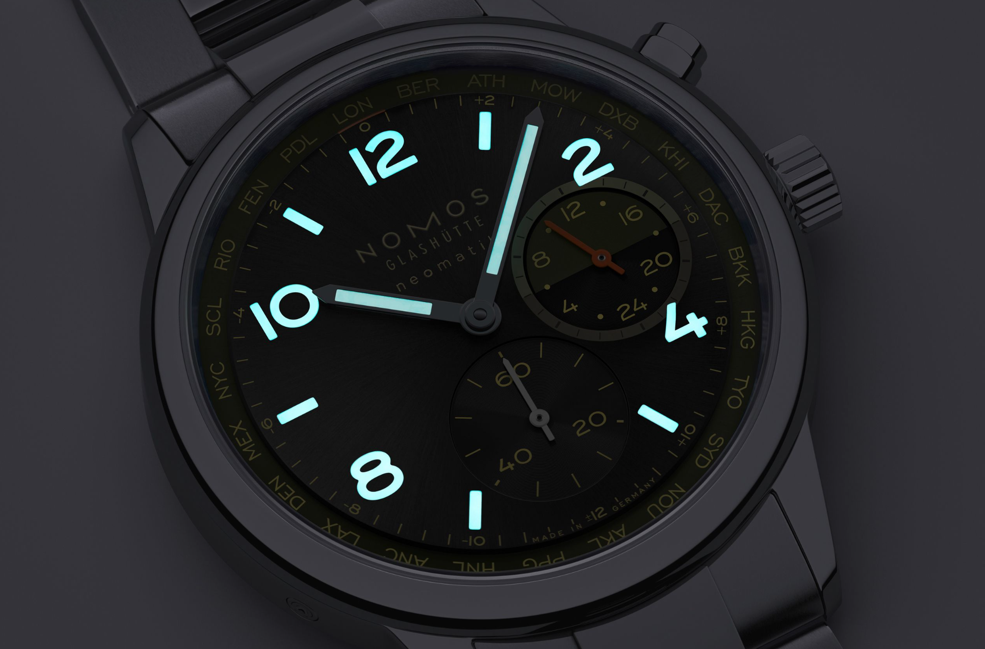 The Night Navigation series of the NOMOS Worldtimer is dedicated to nocturnal city life around the globe. Vector, with a dial in black, olive, and lighter accents, is reminiscent of the navigational instruments in a cockpit or street signs in a foreign city. The worldtime watch shows 24 time zones at a glance and has a 24-hour day and night display for a second time zone. The edition is limited to 175 pieces each—for an exclusive and personal connection with the world.