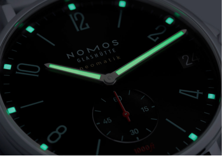 rhodium-plated, hour and minute hands with sand-colored superluminova inlay, seconds hand red