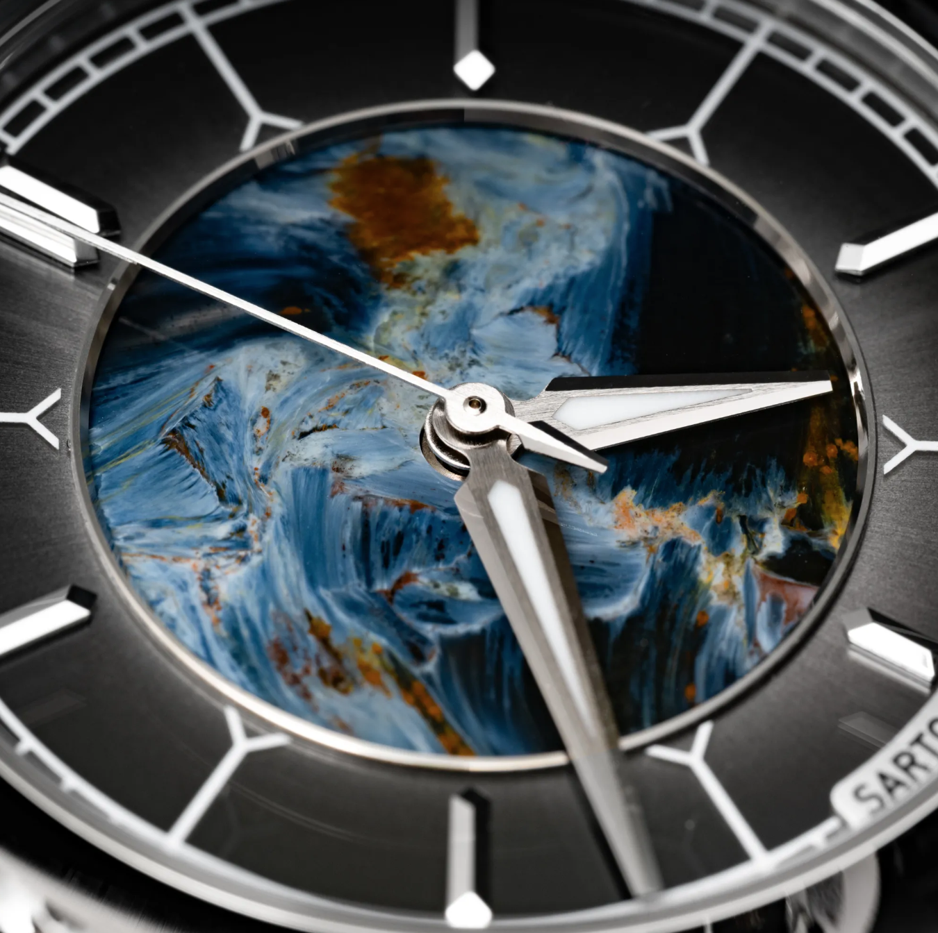 Pietersite is known for its swirling patterns and storm-like appearance. With colors ranging from deep blue to gold and bronze, it reflects the wild energy of natural forces. The stone’s shifting texture gives the dial a sense of movement, like a storm frozen in time.