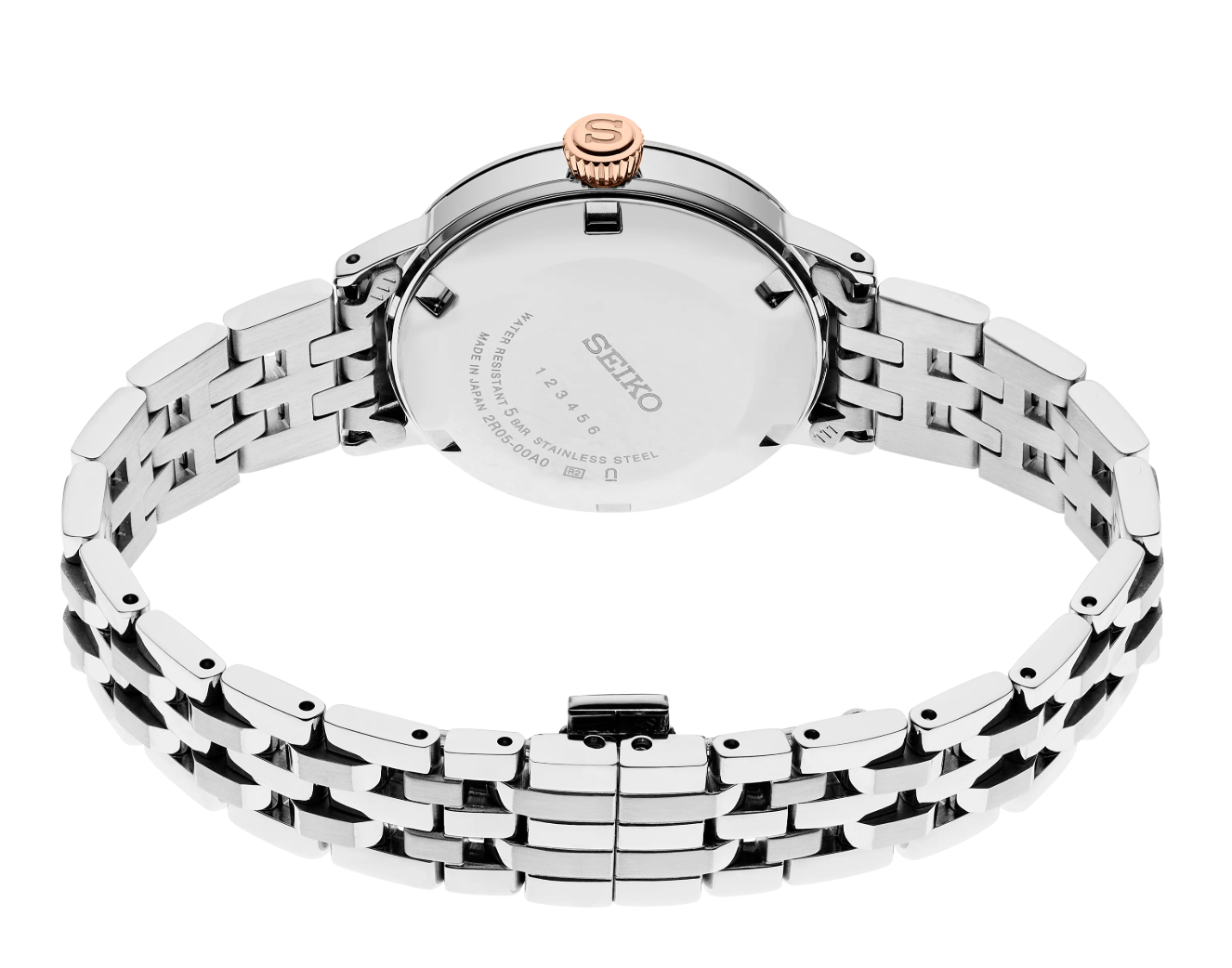 Seiko Presage Cocktail Time. Offering the finest in Japanese mechanical watchmaking, the Presage Collection blends precision technology with superior craftsmanship and design. Inspired by the vibrance of the city's modern lounges, the newest Cocktail Time designs express the excitement of today's Tokyo, with fresh styling and colors. With 8 diamonds adding sparkle to a white dial with pressed pattern, gloss finish, and rose gold accents, this exquisite timepiece evokes the Clover Club cocktail. Sleek and elegant, the gracefully slender case houses the new, thinner caliber 21-jewel automatic mechanical 2R05 movement, which beats at a frequency of 21,600 vibrations per hour, with a power reserve of approximately 41 hours and manual winding capability. The beautifully tapered five-row bracelet features a mirror finish for additional brilliance. Crafted of stainless steel, with date calendar, box-shaped crystal, screwdown caseback, and deployment clasp with push button release. 5 bar, 50M Water Resistant