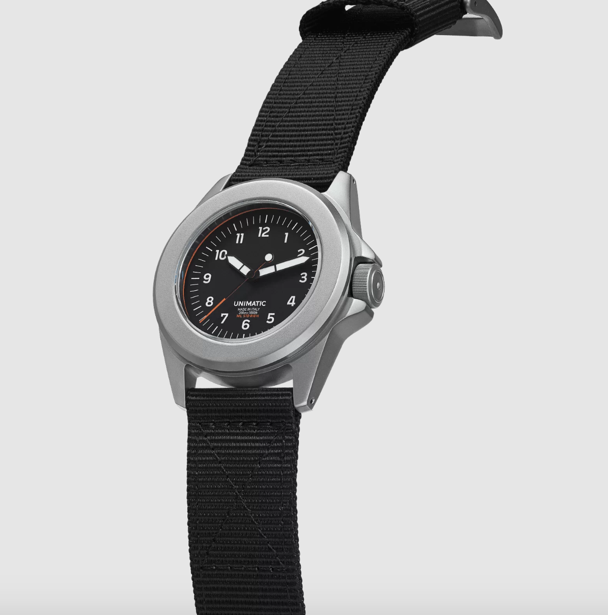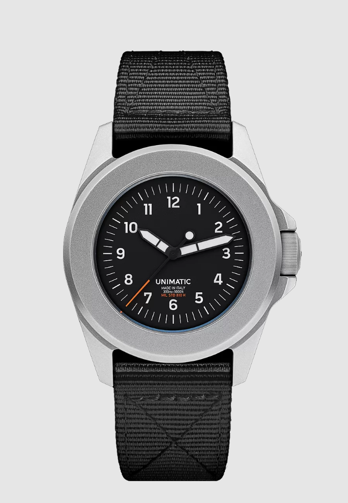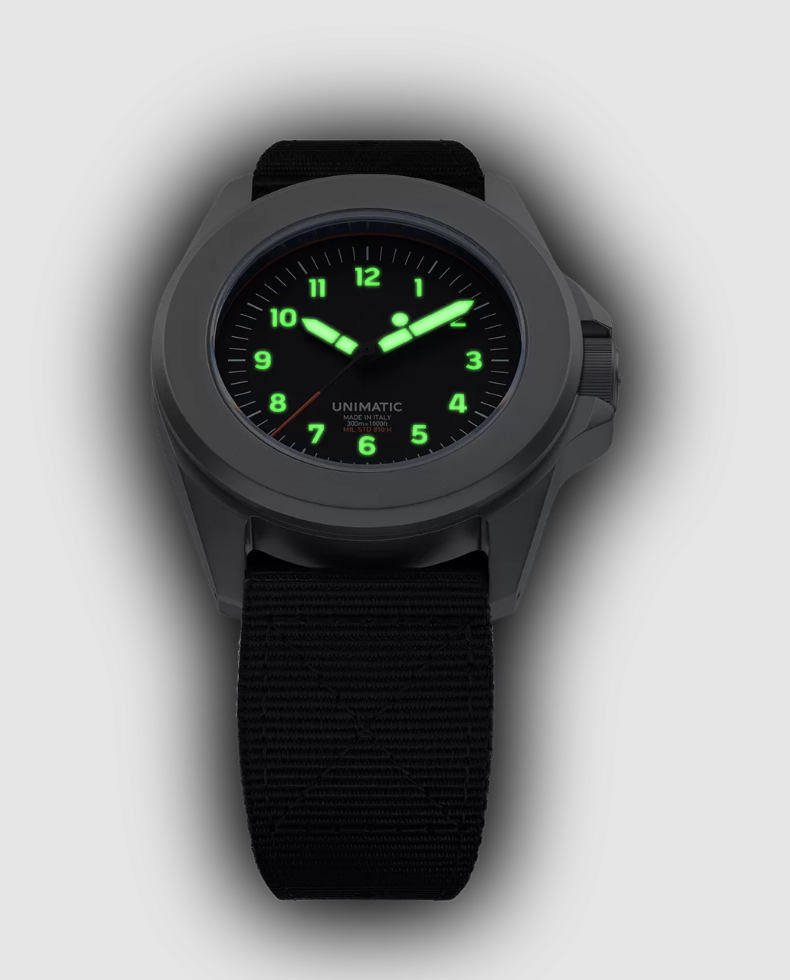 The Modello Quattro ref. UT4 is part of the second UNIMATIC permanent edition – Toolwatch, built to meet the demands of an active lifestyle. Thanks to its reliable movement and the in-house designed 360° protection system, and with its 300m water resistance, this reference is tested to withstand MIL-STD-810H standard. It comes in a practical travel-friendly UNIMATIC tough pouch.